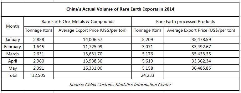 Driven by the growing demand in high tech applications and lower rare earth prices, China’s rare earth shipments have steadily grown since the start of 2014. China exported a total of 12,505 tons of rare earth ore, metals and compounds in the first five months this year, representing a 60.4% increase from the 7,796 shipped in the same period of 2013 according to statistics released on June 23th by China Customs Statistics Information Center.